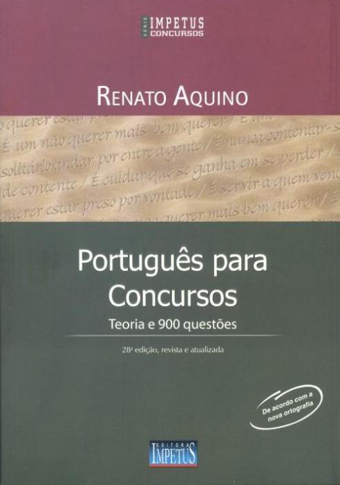 Aliando a constatação de que Português é uma das disciplinas com mais alto índice de reprovações, em certames públicos e privados, à sua larga experiência como consagrado professor de cursos preparatórios para concursos, Renato Aquino desenvolve a obra Português para Concursos. Esse manual, simples e objetivo, apresenta de forma descomplicada os aspectos gramaticais imprescindíveis à realização de provas e essenciais a todos aqueles que precisem desenvolver seus conhecimentos da língua pátria, sem o rebuscamento com o qual o tema é tratado pelas gramáticas tradicionais. Em sua 28ª edição, além de todo o conteúdo gramatical e das 900 questões, já tradicionais, apresenta a estrutura diferenciada que marca a Série Impetus Concursos. Uma ferramenta atual e prática, que prima por oferecer o máximo de informação sem desperdiçar tempo de estudo e energia do candidato, a obra constitui verdadeiro diferencial para estudantes que se preparam para concursos de todos os níveis. Atualizada segundo a nova ortografia. Possui questões comentadas.